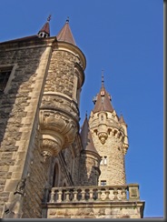 Najpierw chciałam zobaczyć zamek od strony dziedzińca. Szłam więc ścieżką prowadzącą wzdłuż jego murów. Dostrzegłam wiele ciekawych, nieraz zaskakujących elementów zdobniczych. Niektóre z nich pobudziły wyobraźnię, wywołując pewne skojarzenia. Był tam niedźwiedź, który jakby zastygł, nie mogąc wydostać się z zamkowych murów, jakby zaklęła go zła czarownica. Dalej zauważyłam sowę, wpatrzoną w jakiś punkt, jakby czekającą na coś lub kogoś… Gdy uniosłam wzrok w górę w jednym z okien wieży ujrzałam “kościstą”, białą postać. Zresztą zobaczcie sami: